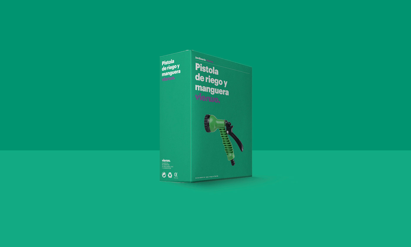 Yierwo cuenta con tres líneas de productos: fontanería, jardinería y ferretería. A cada uno de ellas le asignamos una combinación de colores, siguiendo las mismas pautas que habíamos definido para la marca principal. Por otra parte, el packaging que diseñamos fue pensado para presentar el producto sin ninguna cobertura tipo blíster de por medio: queríamos que el producto en sí fuese el protagonista, y para ello había que eliminar del soporte elementos innecesarios. De esta manera redujimos los obstáculos entre el consumidor y el producto de Yierwo, que ya ha quedado listo para ser distribuido en tiendas especializadas en bricolaje del país.