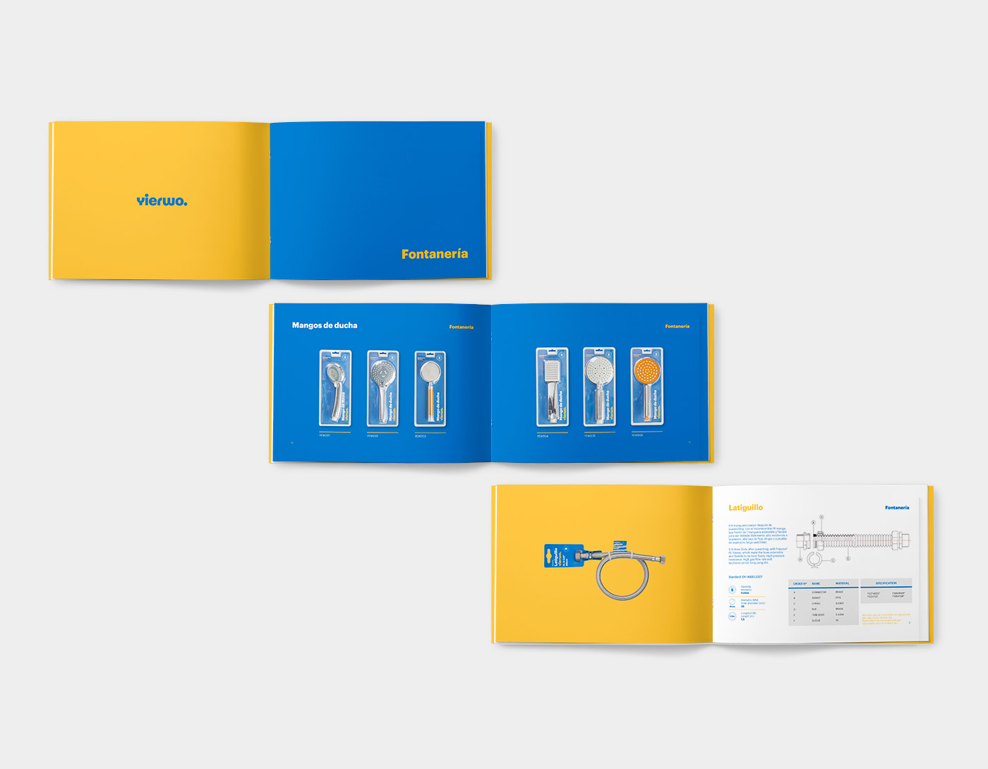 Yierwo cuenta con tres líneas de productos: fontanería, jardinería y ferretería. A cada uno de ellas le asignamos una combinación de colores, siguiendo las mismas pautas que habíamos definido para la marca principal.