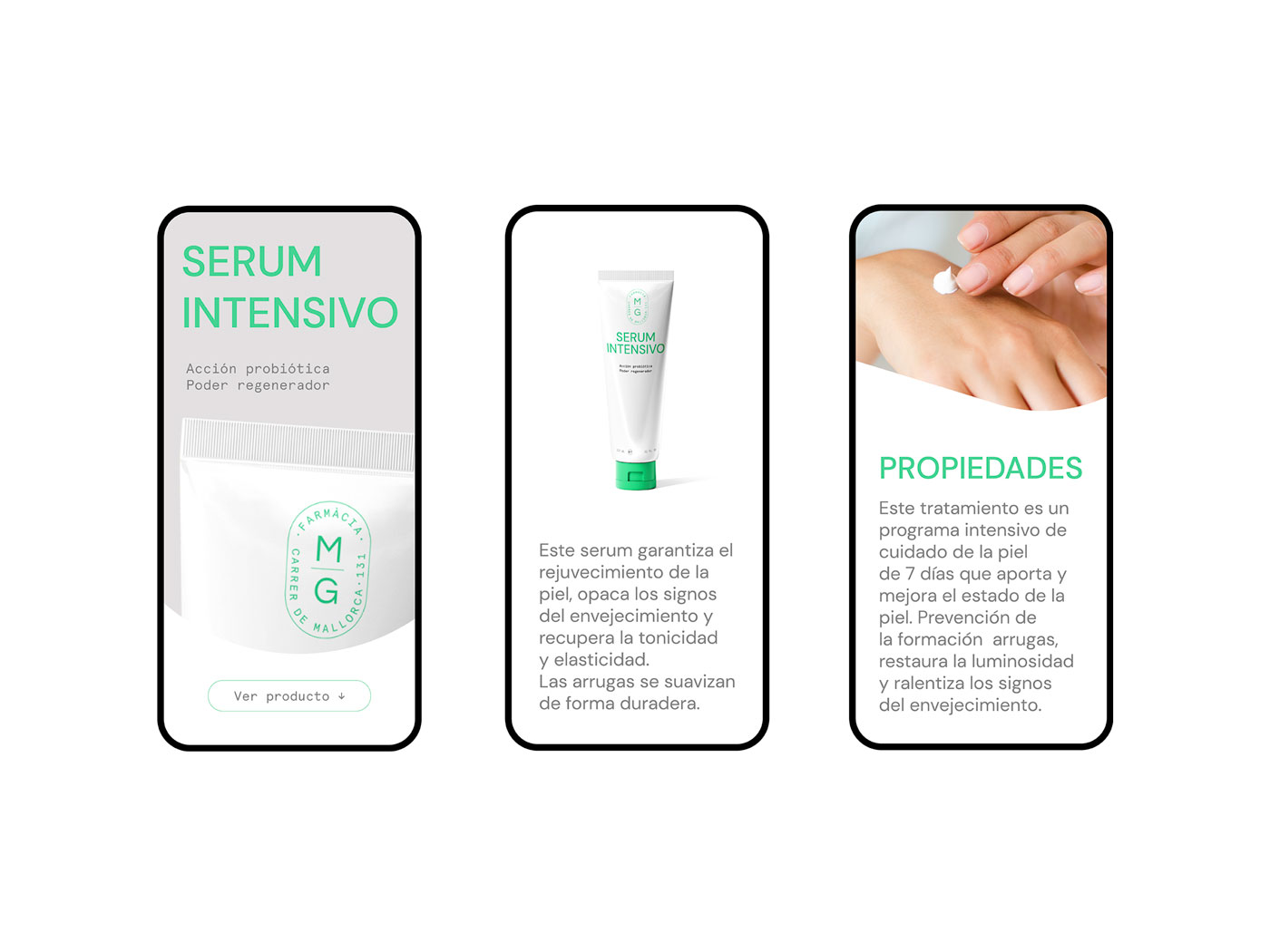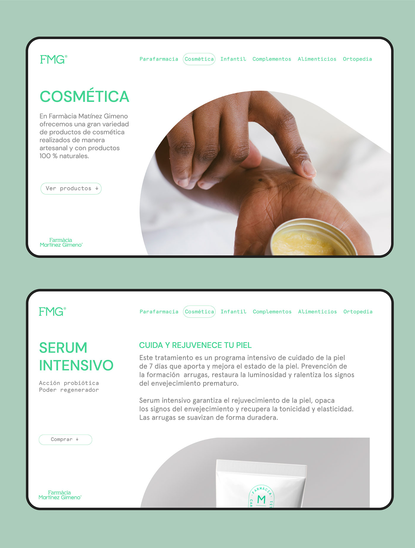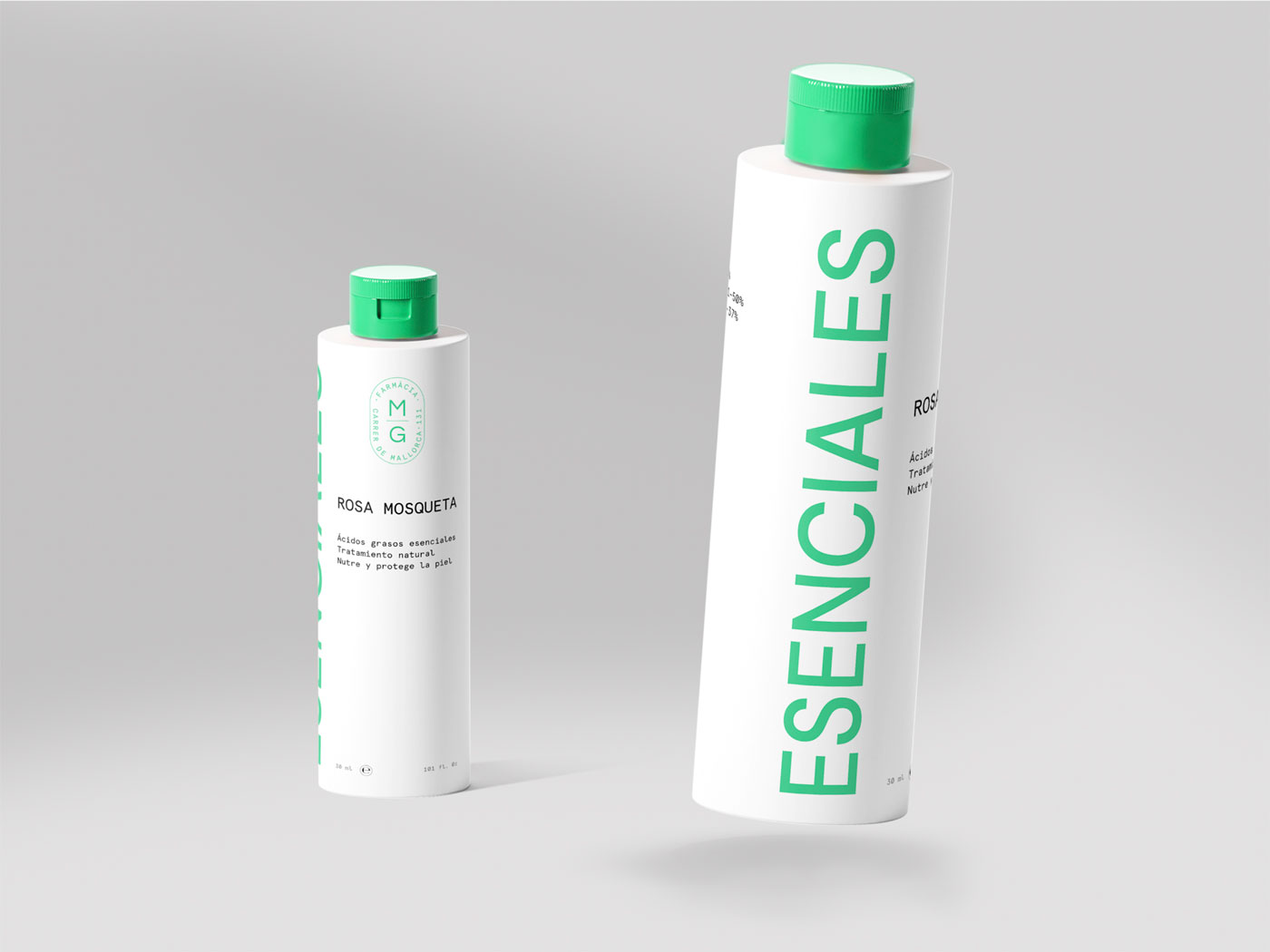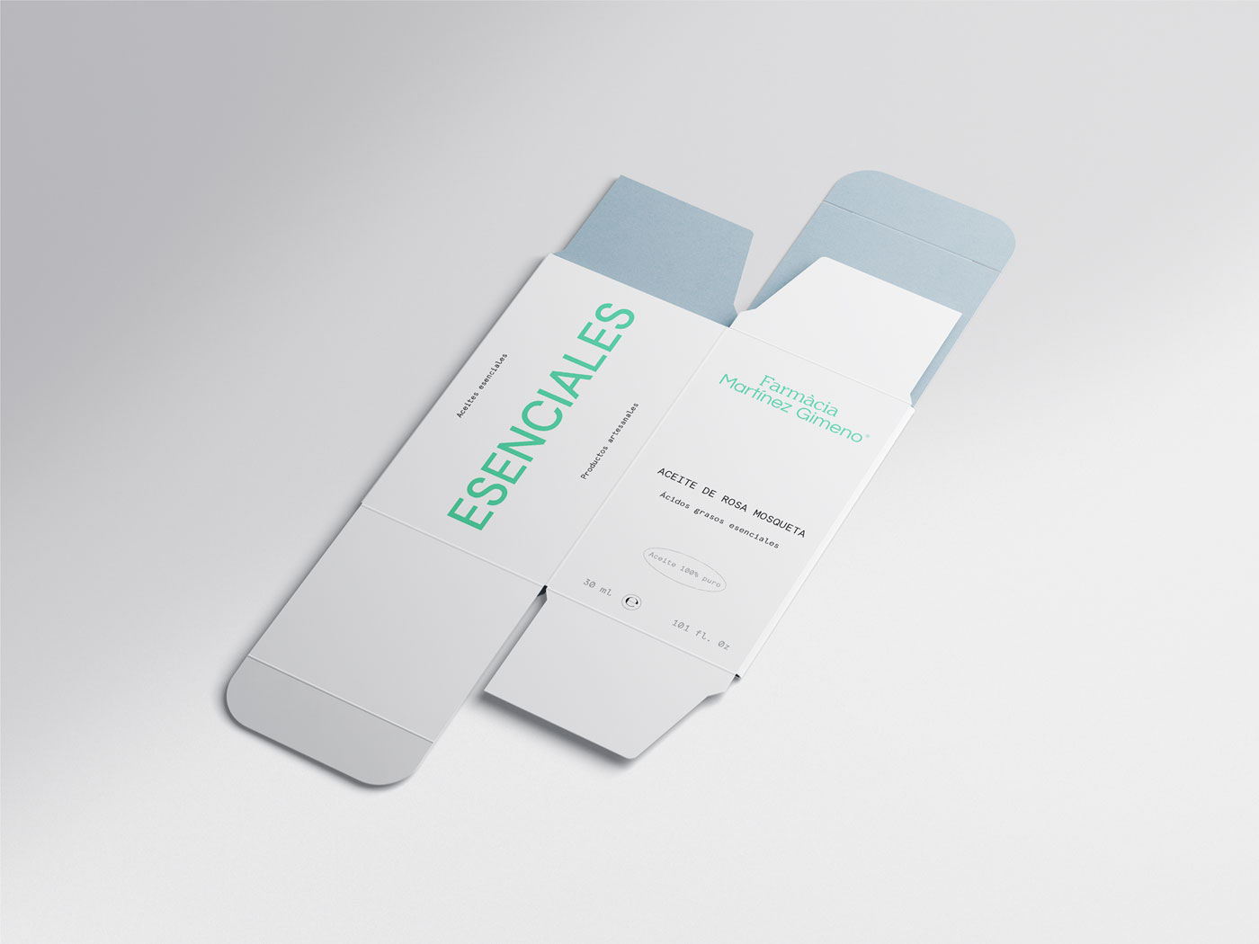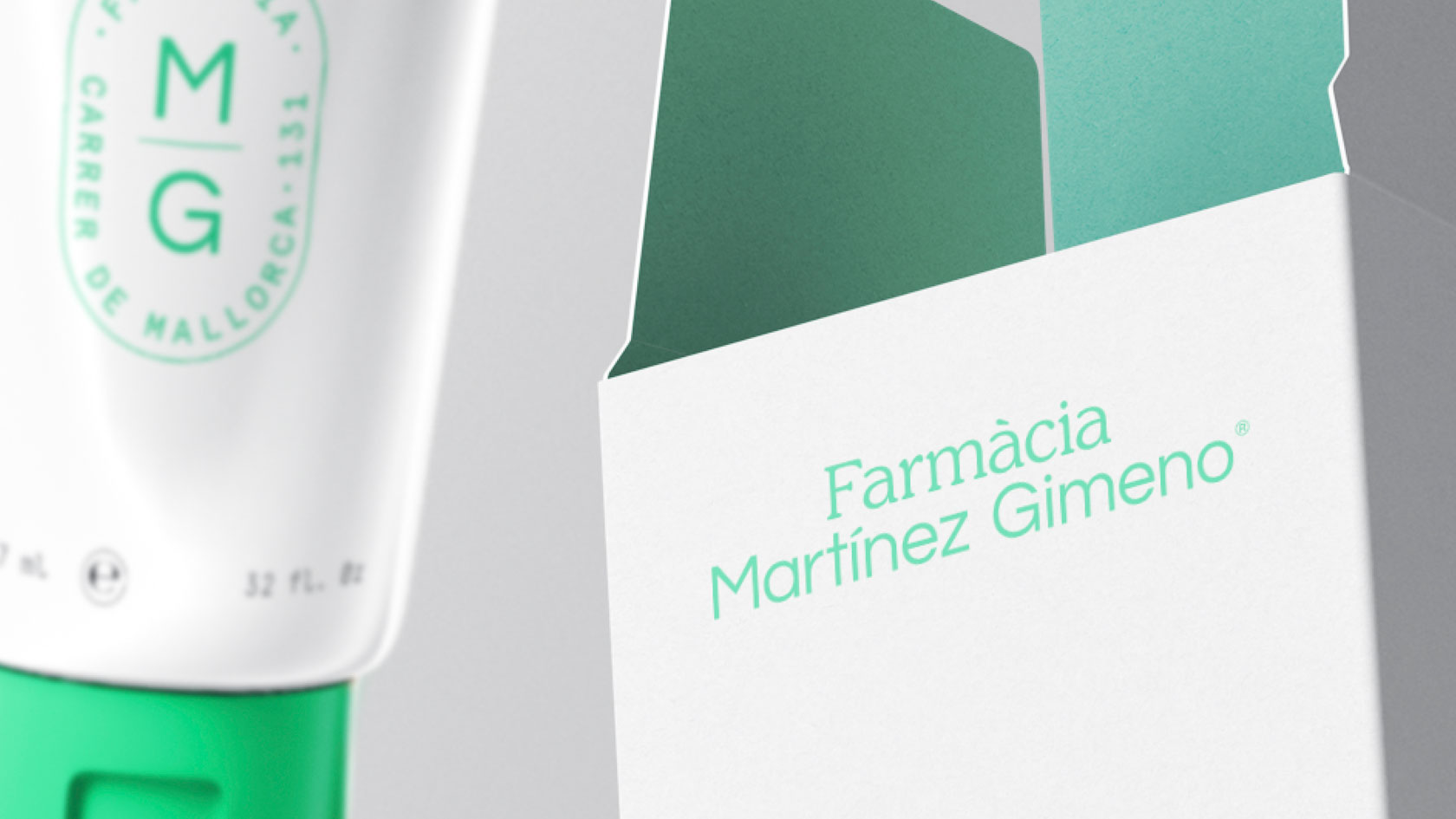Para el logotipo se decidieron combinar dos tipografías, una de palo seco y una serifa, resultando una marca clara y sincera que está en línea con los valores y la historia de la farmacia. En cuanto al color, se eligió como principal el verde menta, con el objetivo de apostar por unos códigos que se identifican con el sector pero que, a la vez, se salen de lo común. Como apoyo, se utiliza el blanco, aportando limpieza y haciendo del producto el protagonista.