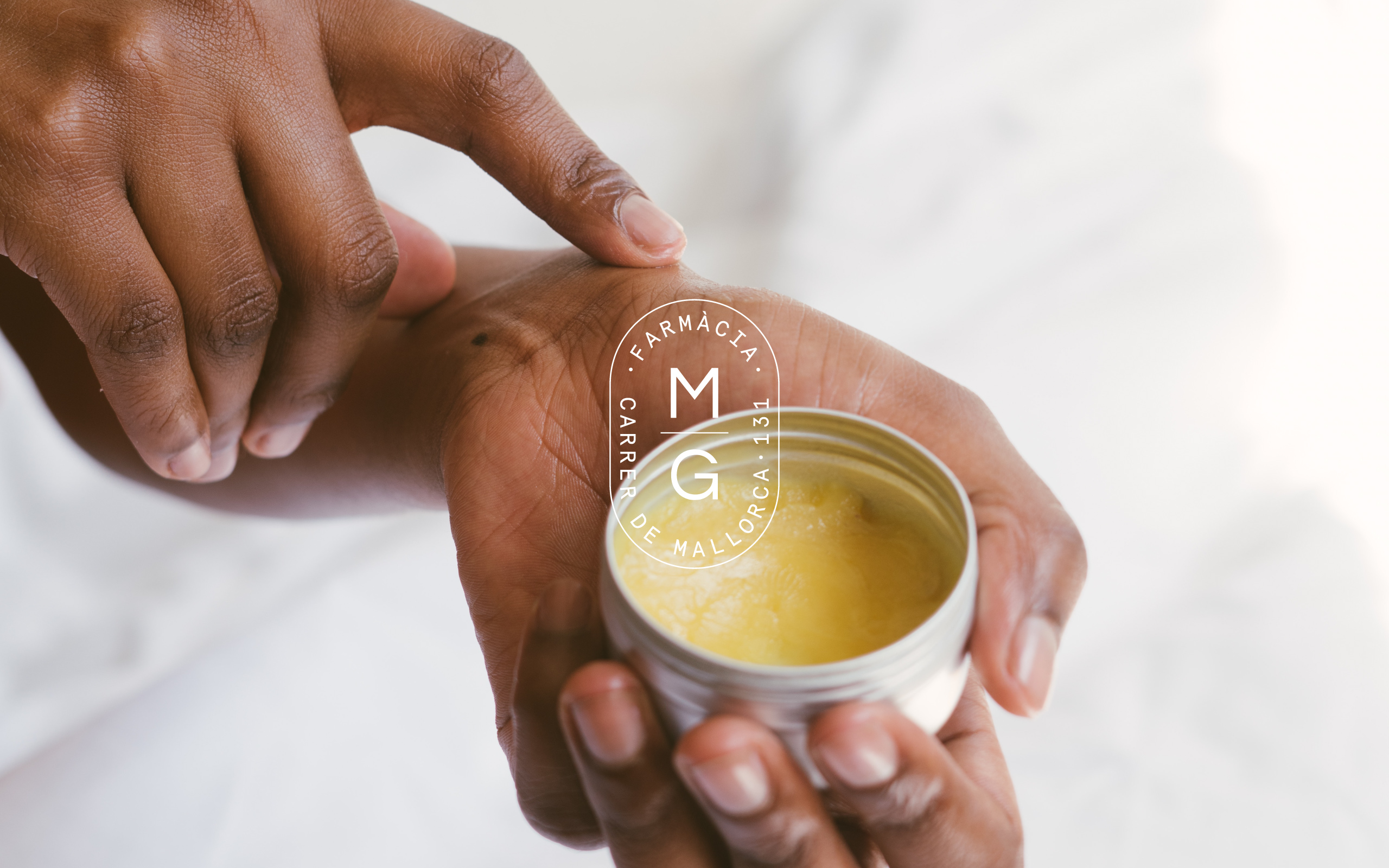 Para las fotografías que acompañan a la gráfica creada se utilizan las manos como protagonistas, aportando un toque de calidez a la imagen global de la farmacia.