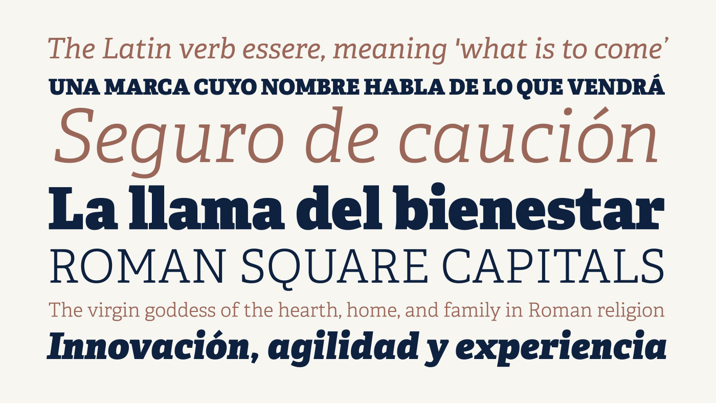Desarrollamos la tipografía basándonos en las robustas letras capitales romanas, que aportan los valores de fuerza y seriedad que buscábamos, pero actualizando sus formas usando una fuente slab que modificamos ligeramente para que sugiriese ilustres rasgos romanos.