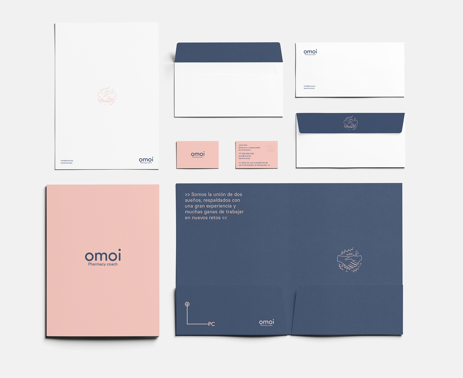 Decidimos plasmar la filosofía sánscrita en cada detalle, especialmente en su diseño de isotipo, donde representamos a dos manos tendidas en señal de apoyo y disposición a ayudar y a acompañar en el camino; filosofía que abrazaba el proyecto con respecto a las farmacias. Asimismo, para la impresión de todos los materiales elegimos texturas naturales y una gama cromática para toda la imagen corporativa que jugaba con el gris, el rosa pastel y el azul oscuro.